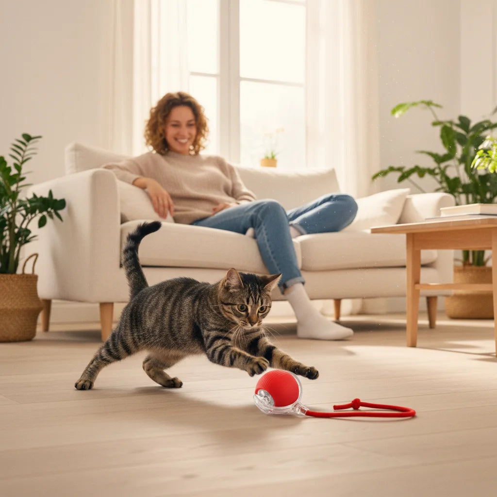 Félisphère se déplace automatiquement, évite les obstacles et se réactive au toucher. Aucun contrôle requis : ton chat joue quand il veut, sans que tu aies à intervenir.